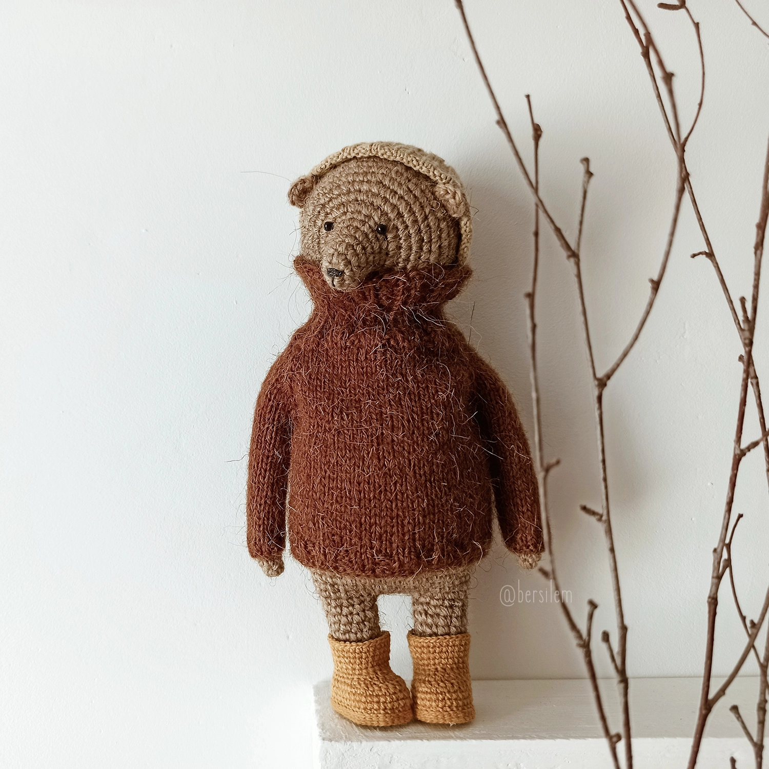 Шапка и свитер вяжутся спицами, а сапоги - крючком